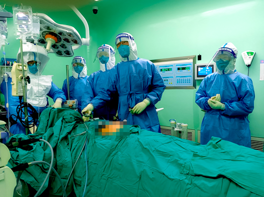 “马上准备,尽快手术!”经综合检查后,判断患者诊断为急性腹膜炎(阑尾炎穿孔可能性极大),五分区“区长”丁俊当即决定进行手术。在定点医院医务处、院感科、手术室等部门通力配合,外科团队及手术室相关医护人员按照新冠核酸阳性患者手术流程有条不紊地进行,患者转危为安。