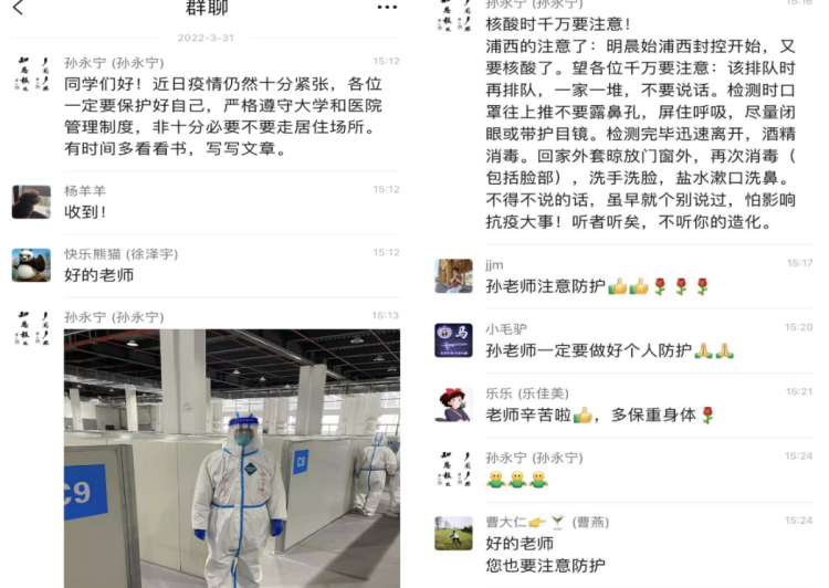 普陀临床医学院的夏琪同学常常在深夜和凌晨收到殷佩浩老师的问候关心短信。原来,殷老师是上海普陀跨采中心方舱医院院长,每天结束一天的工作,才有机会发短信关心学生们。