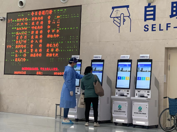 图说:海军军医大学第三附属医院在门诊挂号机安排专人引导代配药志愿者