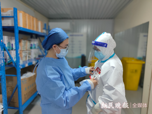 图说:刘晟宏(左)为张莹的防护服上贴上名字 新民晚报记者 郜阳 摄(下同)