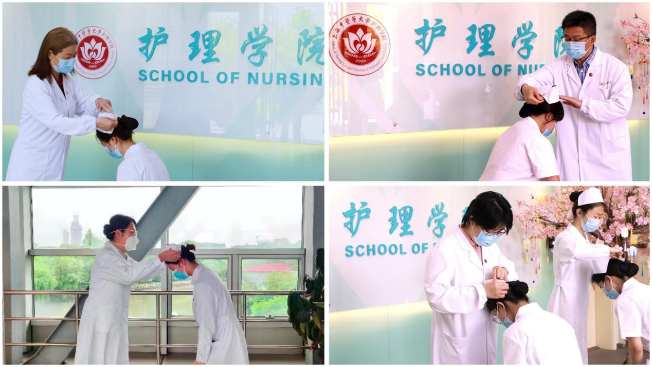 学校领导、职能部门负责人和护理学院教师代表一起,分别在校园和学校附属曙光医院东院为护生代表授帽,把寓意传承与责任的白色燕尾帽,庄严郑重地授予即将步入临床学习的护理学子。
