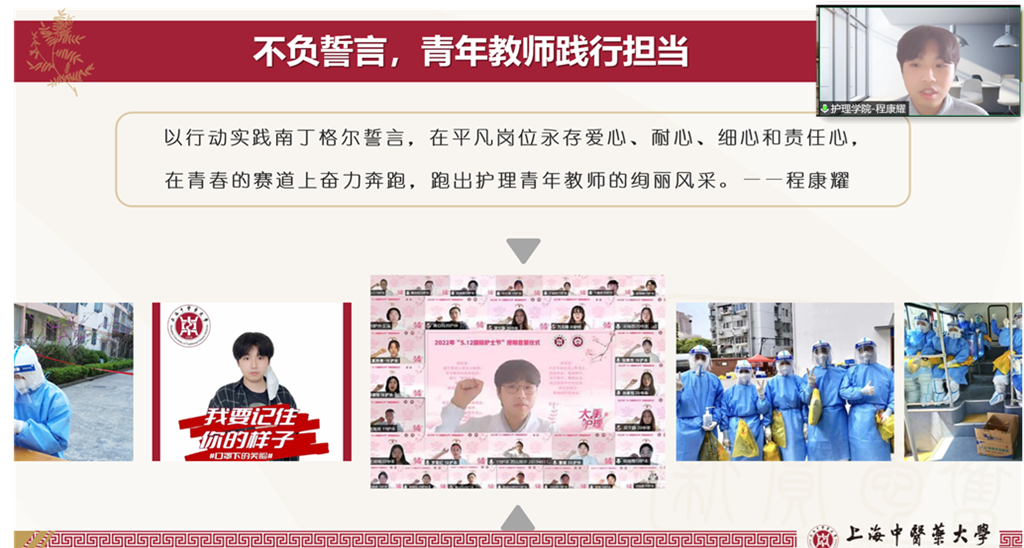 “抗疫战场是最鲜活的思政育人大课堂。短短的10天,来到了战‘疫’一线,看到了太多的感动,也看到了中华民族新时代青年的希望。”程康耀感慨地说:“作为一名青年教师,我深刻感受到身上的责任与使命。我将和他们一起继续以行动实践南丁格尔誓言,在青春的赛道上奋力奔跑!”