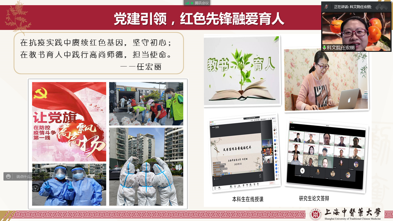 任宏丽谈到,此次抗击疫情,其所在支部全体党员充分发挥模范带头作用,积极参与到一线志愿服务工作中:协助核酸检测、参与社区巡逻、传递爱心物资、承担楼道消杀、开展科普宣传;主动帮扶结对共建的新丰村党总支,协助居民解决配药难题,帮助血透老人及时就医;积极响应团市委号召,关心关爱一线防疫工作人员子女学习,承担学校爱心“云托班”健康辅导课程的三讲授课……她对“伟大抗疫精神”有了更深刻的感悟。作为一线教师,她结合线上教学特点认真做好课程设计,调整教学方法,保证教学不停、质量不减;作为一名研究生导师,她主动关心困难学生,鼓励他们理性看待疫情,保持良好心态。