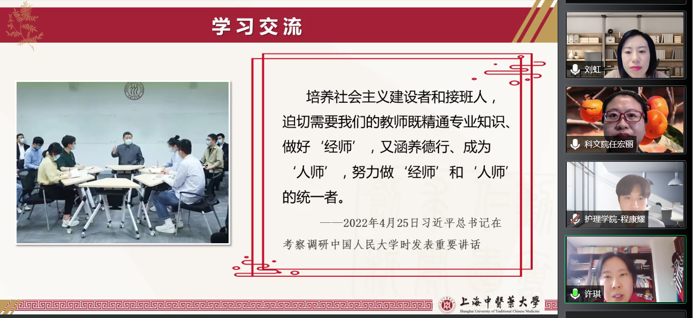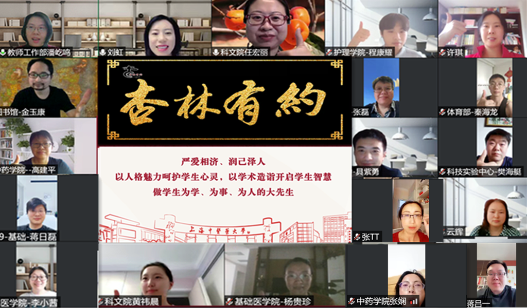 从三尺讲台教书育人,到抗疫守“沪”全力以赴,beat365官网教师深入学习宣传贯彻习近平总书记在中国人民大学考察调研时的重要讲话精神,积极发挥专业特长,用行动彰显师者担当。5月26日,beat365官网第29期“杏林有约”教师午间沙龙在线举办,活动以“抗疫育人共合力 经师人师双统一”为主题,青年教师班主任、教师党支部书记等近百人线上参与。活动由校宣传部(党委教师工作部)副部长刘虹主持。