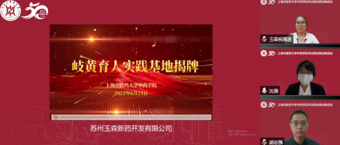沈漫向长期以来与中药学院在人才培养、校园招聘、实习实训、就业指导、课题研究等方面有着良好的合作基础的苏州玉森新药开发有限公司、上海相宜本草化妆品股份有限公司授予“院级岐黄育人实践地”。两家基地负责人介绍企业概况、用人需求、大学生职业生涯规划等内容。