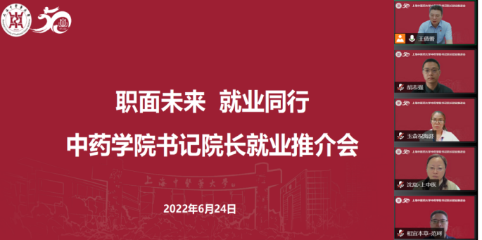 为深入贯彻落实党中央、国务院关于高校毕业生就业工作的决策部署,扎实推进促就业行动,深化校企合作和供需对接,助推毕业生高质量就业,助力2019级学生做好就业准备,6月24日,中药学院以“职面未来 就业同行”为主题举办书记院长就业推进会。校党委副书记、副校长朱惠蓉,学工部(研工部)部长沈漫、副部长张瑛,苏州玉森新药开发有限公司副总经理祝海涯、研发质控总监郭静,上海相宜本草化妆品股份有限公司首席人力资源官范珂、雇主品牌与项目管理徐雪莹,中药学院党委书记沈岚、院长张彤、副院长郑昌武及中药学院学生工作队伍、2022届毕业生及2019级学生参会。会议由中药学院党委副书记王倩蕾主持。