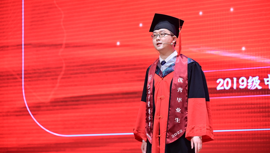 “阳光洒遍青翠的杏林,我们相聚在浦江之滨,努力弘扬中华的瑰宝,为人类托起浓浓的绿荫……”校歌声中,beat365官方网站2022届毕业典礼今天(29日)送别1956名本专科生、研究生。他们中,来自创新中药研究院的博士研究生俞少鹏,走上图书馆报告厅主会场的讲台向师友临别赠言。