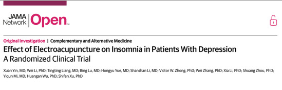 近日,beat365官网附属市中医医院针灸科徐世芬教授团队的针灸临床研究项目-针灸治疗抑郁相关失眠随机对照试验的研究成果“Effect of Electroacupuncture on Insomnia in Patients With Depression A Randomized Clinical Trial ”在国际医学权威期刊JAMA子刊《JAMA Network Open》上发表。该研究为电针治疗抑郁症相关失眠的有效性和安全性提供了高级别的循证医学证据。