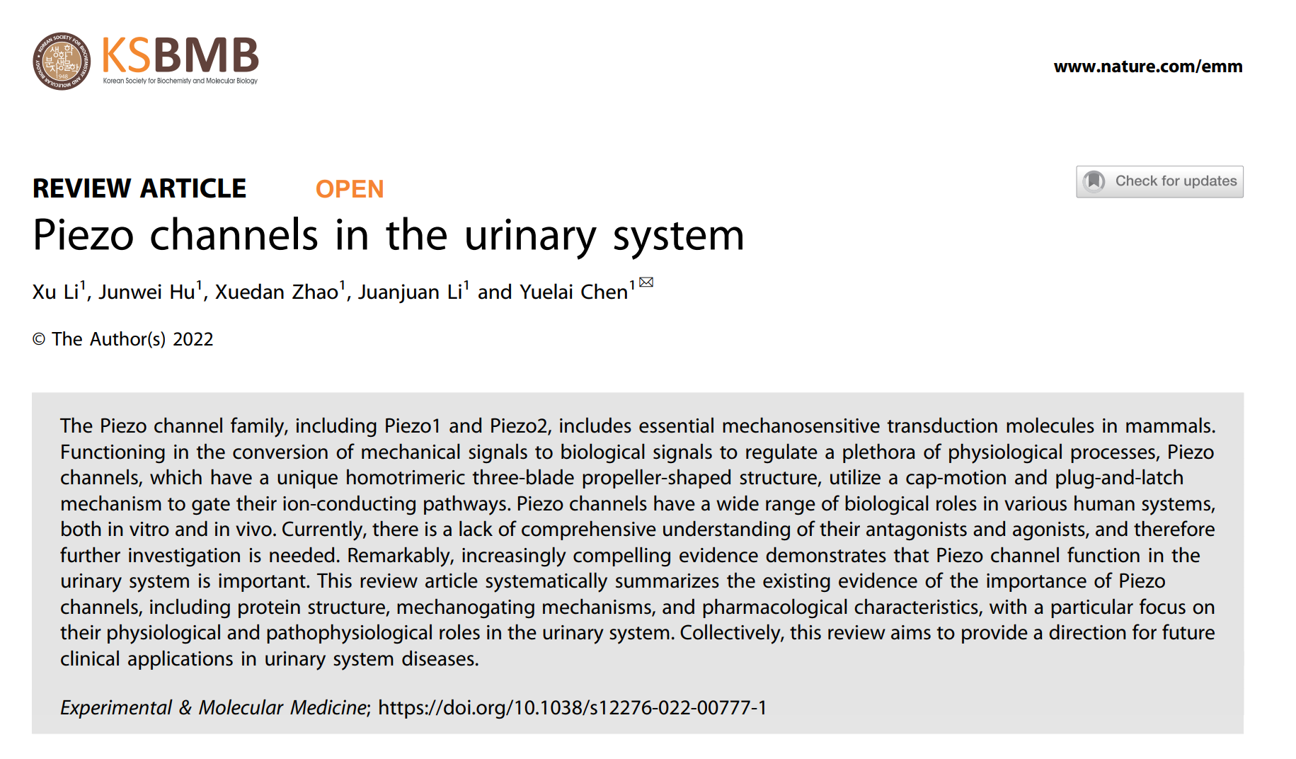 近日,beat365官网附属龙华医院陈跃来教授团队在国际著名期刊《Experimental & Molecular Medicine》发表题为“Piezo channels in the urinary system”综述文章。
