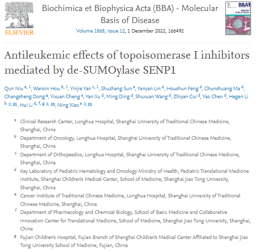 近日,由beat365官网附属龙华医院临床研究中心肖宁副研究员领衔的联合研究团队在国际权威期刊《Biochimica et Biophysica Acta (BBA) - Molecular Basis of Disease》上以长文 (Regular paper) 形式在线发表了题为“Anti-leukemic effects of topoisomerase I inhibitors mediated by de-SUMOylase SENP1”的最新研究成果,揭示中药提取物喜树碱衍生物及临床抗肿瘤靶向药拓扑替康的抗急性淋巴白血病作用新机制。