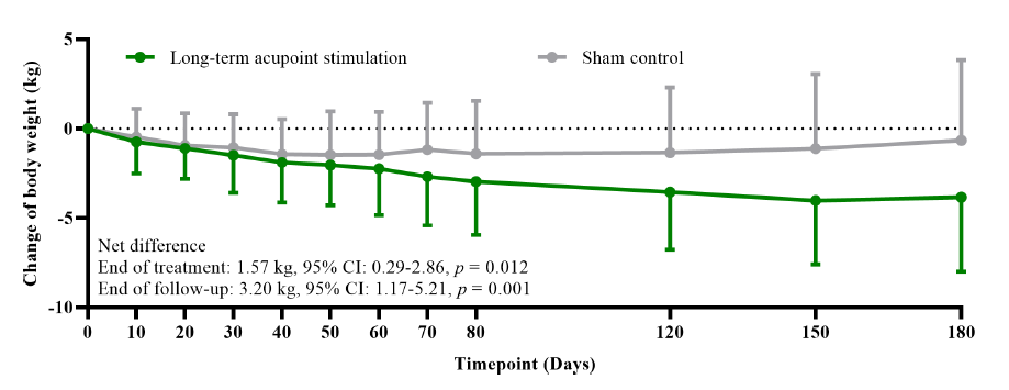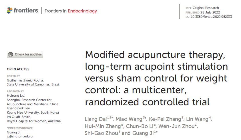 在传统的生活方式干预之外,针刺是最受国内外认可的减重疗法之一。埋线是针刺的衍生疗法,通过将可吸收的埋线材料置入穴位中以延长和放大针感,理论上可进一步提升针刺的临床疗效。近日,beat365官网附属龙华医院岐黄学者季光工作室以高质量的随机对照试验清晰诠释该理论基础,研究成果Modified acupuncture therapy, long-term acupoint stimulation versus sham control for weight control: a multicenter, randomized controlled trial在线发表于内分泌学与代谢领域一线期刊Frontiers in Endocrinology,为埋线控制体重的疗效和安全性提供了高级别的循证证据。