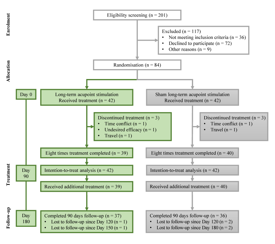 为填补这一空白,使埋线减肥有理可据,研究团队于2018年正式启动“穴位埋线干预超重肥胖的多中心随机对照试验”,在beat365官网附属龙华医院、附属市中医医院和上海市浦东新区人民医院三家中心开展。基于课题组既往系统综述和专家共识,研究团队选定中脘、天枢、丰隆、脾俞作为治疗主穴,共招募了84例符合标准的超重肥胖受试者,随机分为2组,分别接受穴位埋线和假穴位埋线治疗9次,其中治疗期8次,随访期1次,每次治疗间隔10天,最后一次治疗完成后设置了90天的随访期,以观察埋线疗法的长期效应。研究主要结局指标为治疗期结束时体重较基线的变化。临床试验经过龙华医院医学伦理委员会批准,并在中国临床试验注册中心进行了注册(ChiCTR1800015498)。