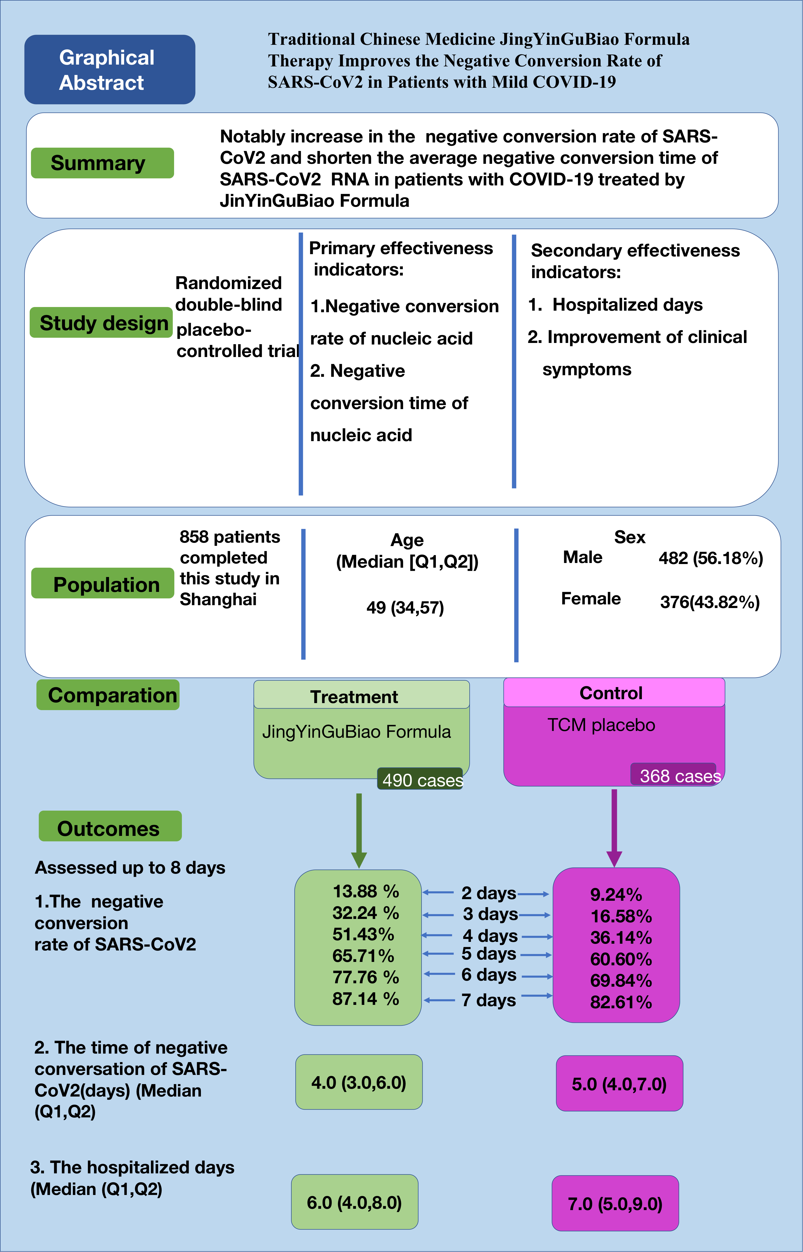 荆银固表方是国家中医药疫病防治基地(beat365官方网站附属曙光医院)联合上海市有关中医药专家制定的《上海市新型冠状病毒感染中医药诊疗专家共识(2022 春季版)》推荐的中药复方。该项研究旨在评价中药荆银固表方治疗轻型COVID-19感染者的安全性和有效性。今年4月8日至5月6日,885例患者随机分为荆银固表方组或中药安慰剂组,疗程7天,主要疗效指标是SARS-CoV2 RNA的转阴率和转阴时间,次要疗效指标是住院天数和症状改善情况。疗程结束,共858例患者完成疗效评价。