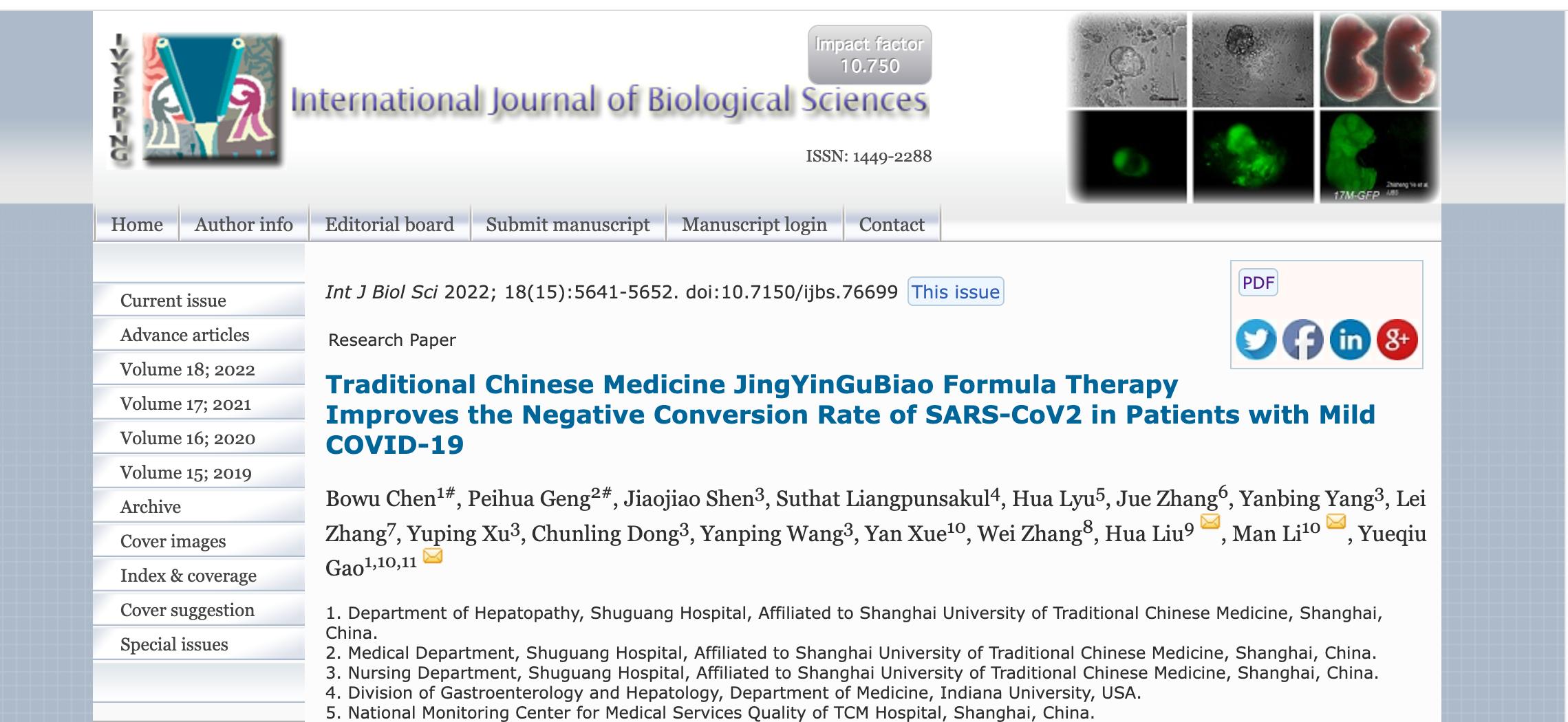 9月1日,beat365官网附属曙光医院高月求教授研究团队在JCR分区Q1期刊International Journal of Biological Sciences发表最新研究成果Traditional Chinese Medicine JingYinGuBiao Formula Therapy Improves the Negative Conversion Rate of SARS-CoV2 in Patients with Mild COVID-19。据检索,该成果为中医药治疗COVID-19奥密克戎变异株感染的首篇随机、双盲、中药安慰剂对照临床研究SCI收录论文。