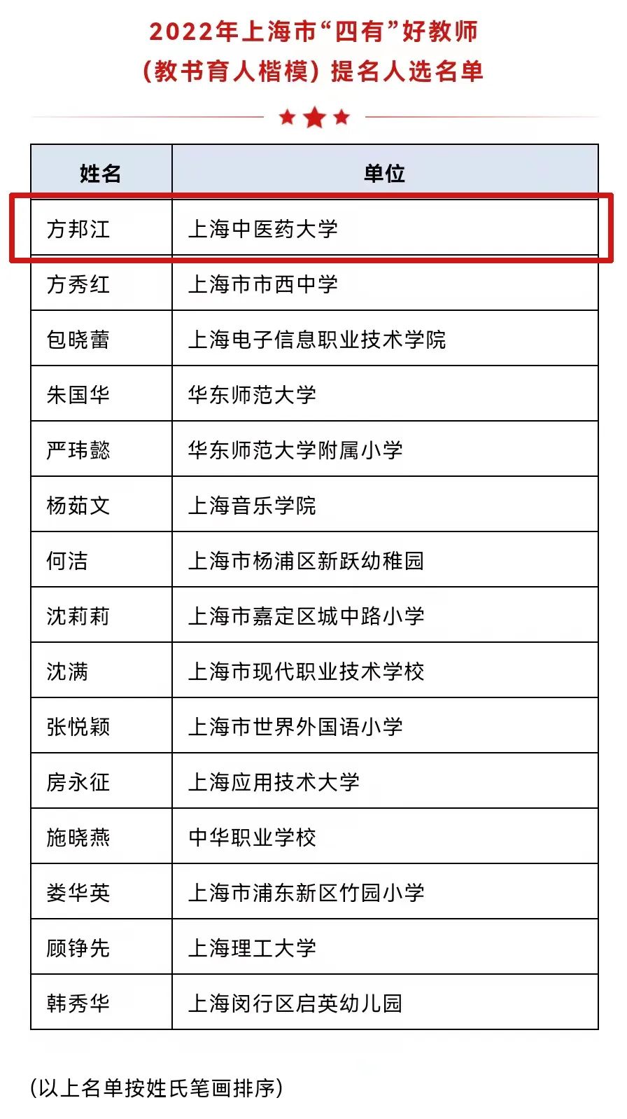 beat365官网方邦江教授入围2022年上海市“四有”好教师(教书育人楷模)提名人选名单