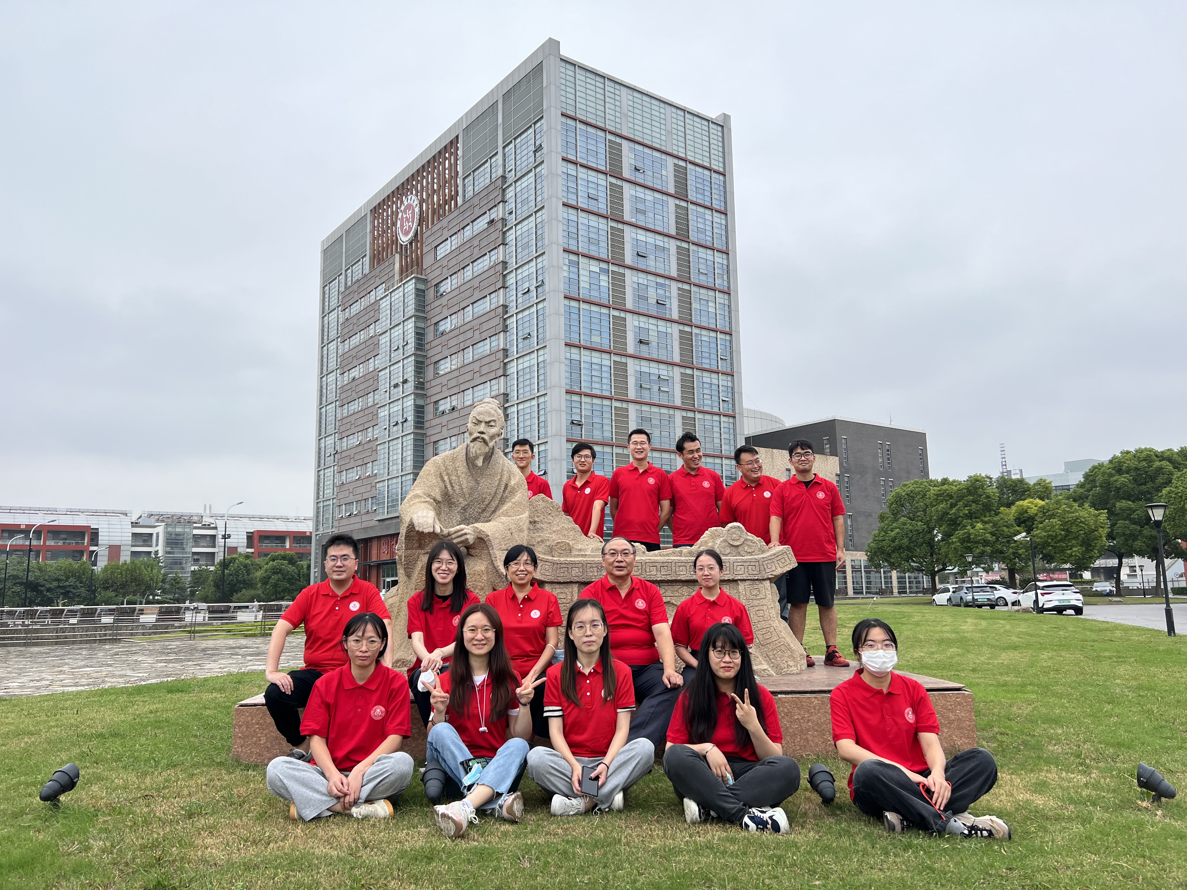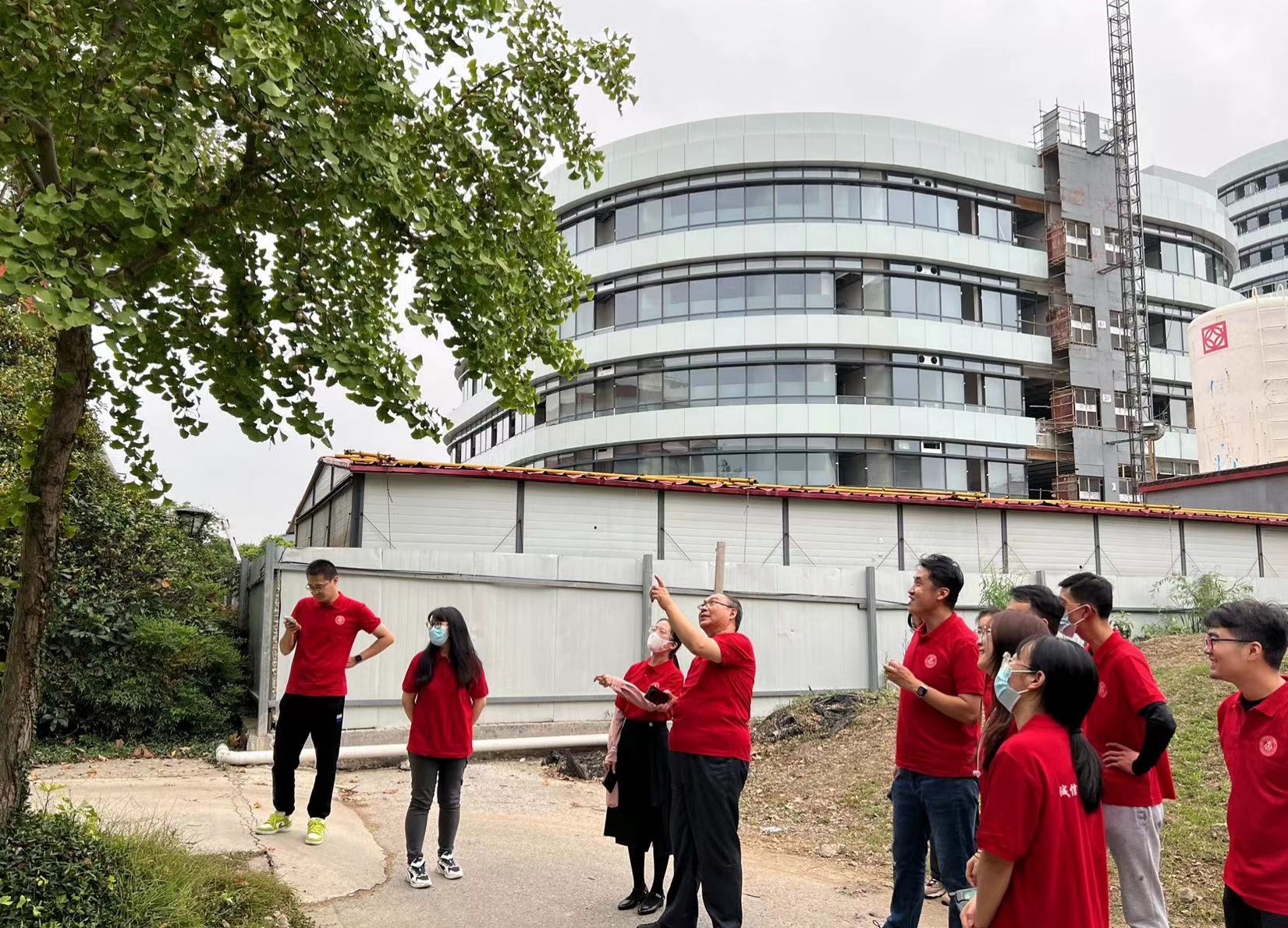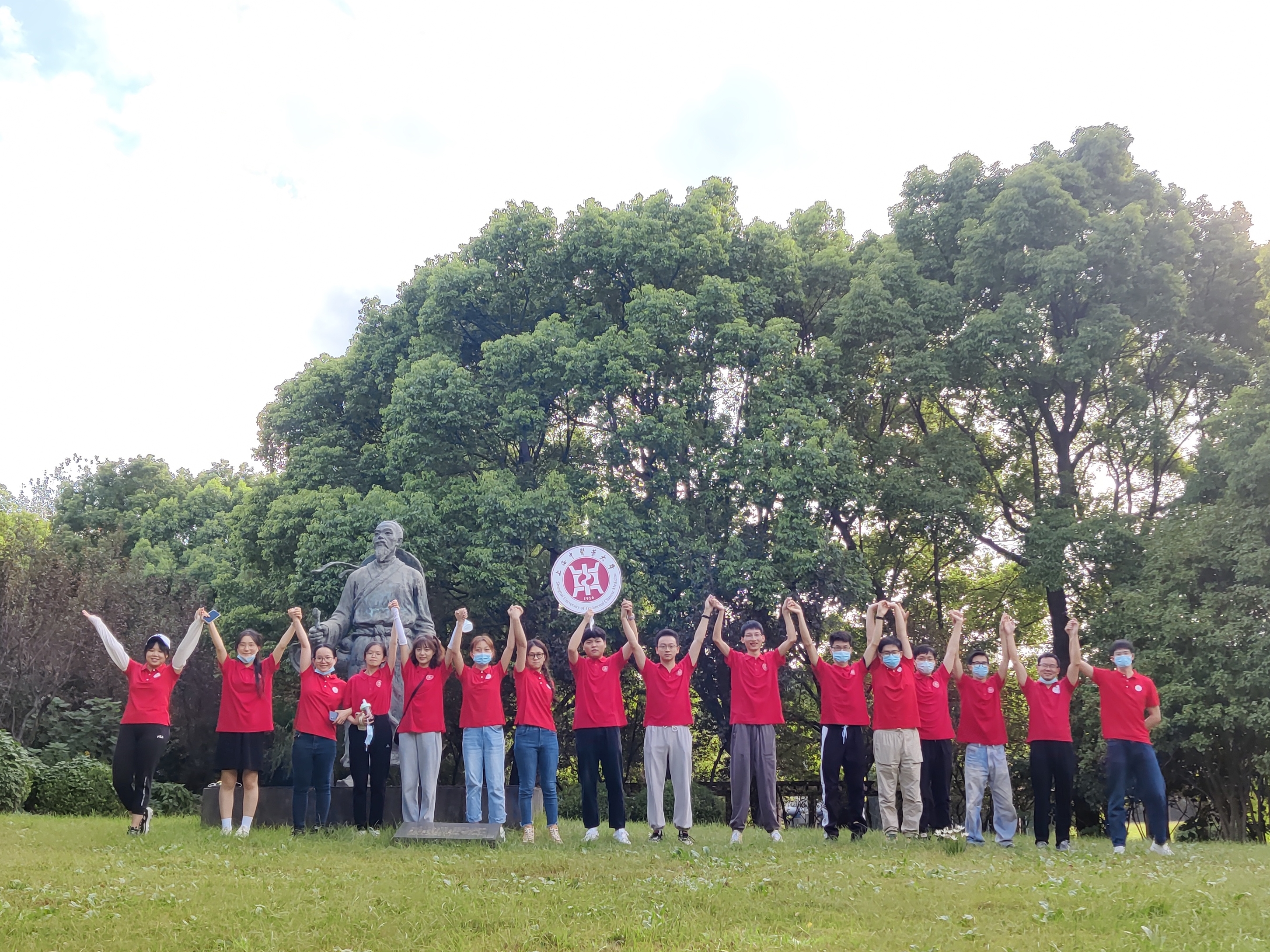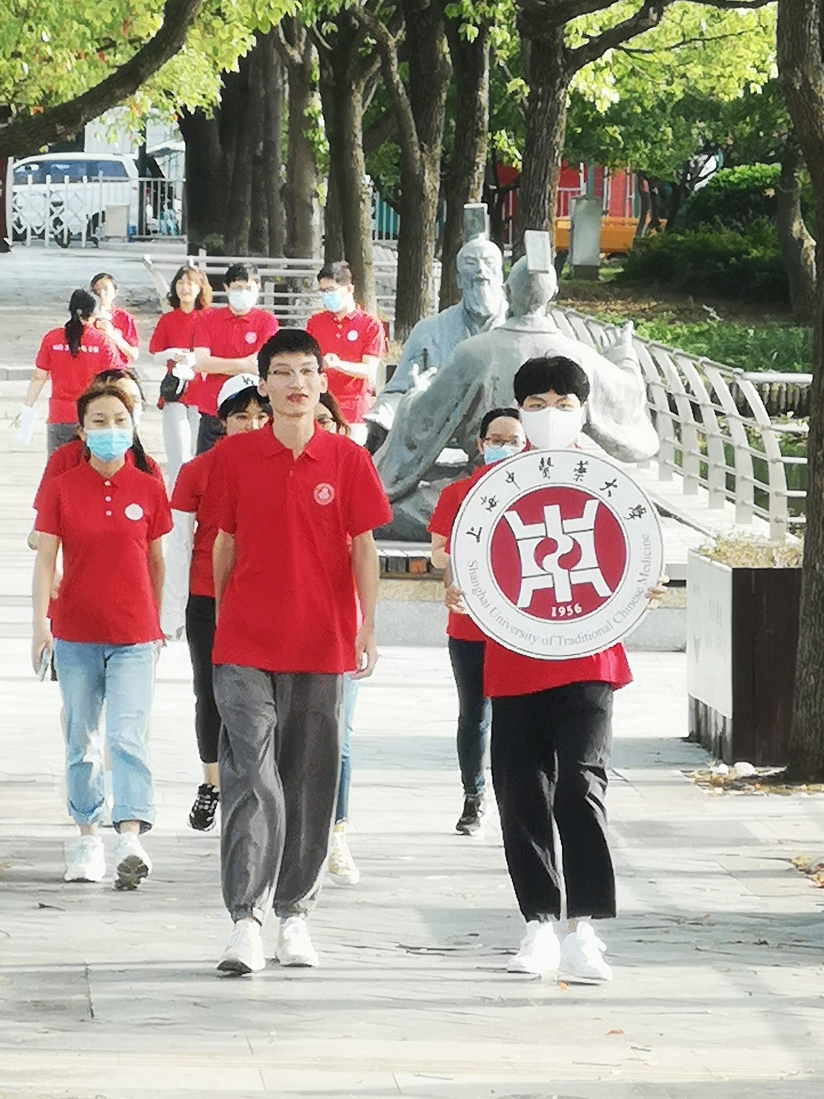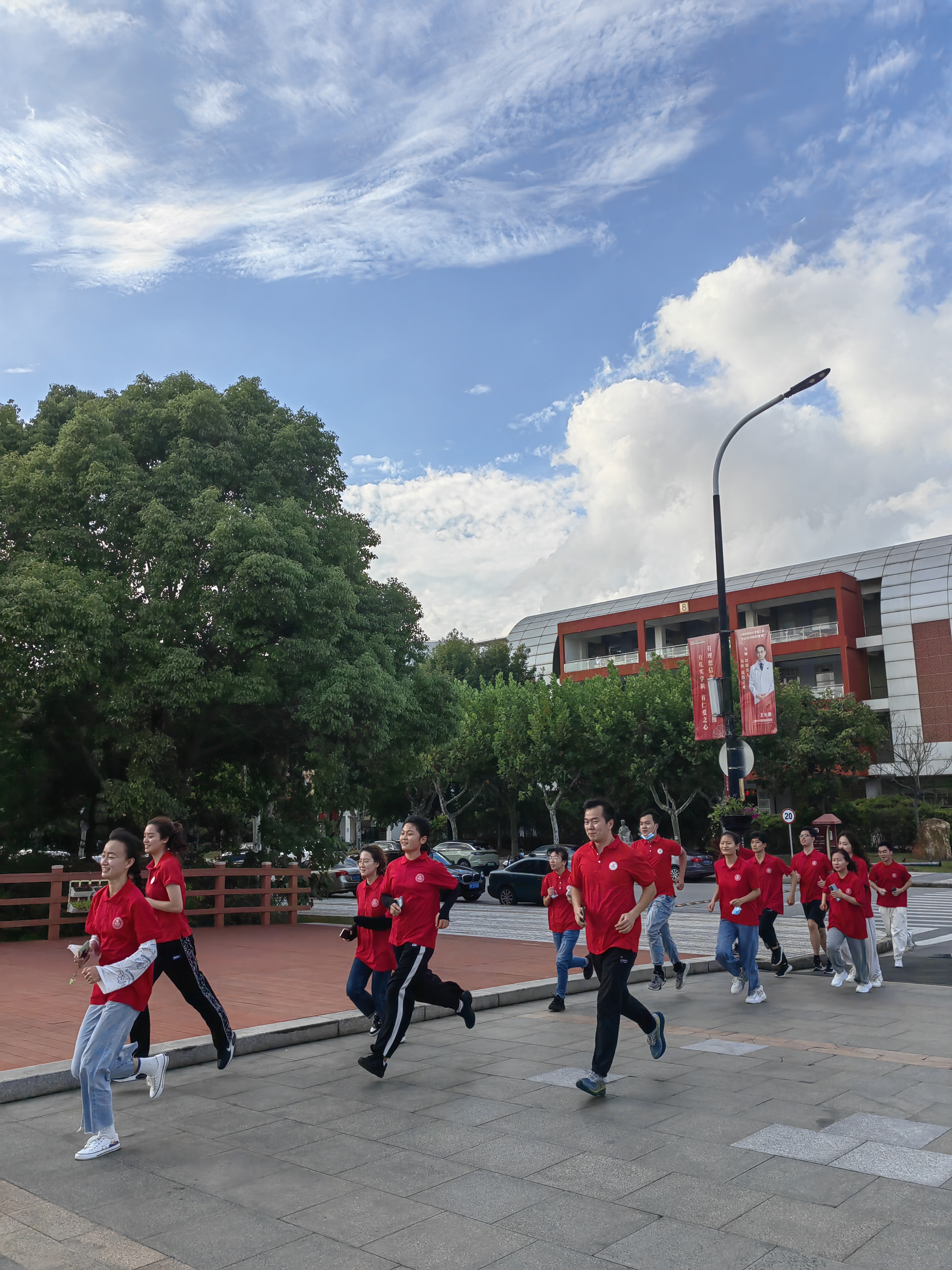 活动中,师生们身着红色主题衫,或行走或跑步,一起兴致勃勃地考察药用植物的外观及生长环境、调查校园植物资源的种类及分布情况。