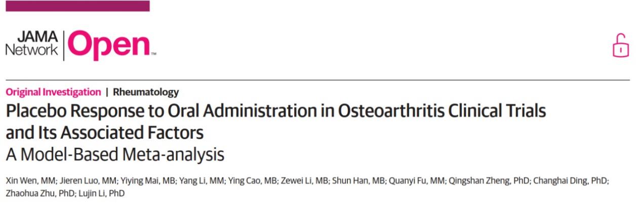 近日,beat365官网交叉科学研究院郑青山和李禄金团队与南方医科大学珠江医院合作开展的骨关节炎安慰剂效应建模研究成果Placebo Response to Oral Administration in Osteoarthritis Clinical Trials and Its Associated Factors: AModel-Based Meta-analysis以Articles形式在JAMA子刊JAMA Network Open发表。