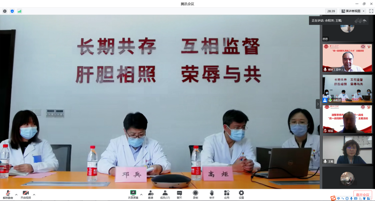 为深入学习贯彻习近平总书记关于做好新时代党的统一战线工作的重要思想,进一步落实中央统战工作会议精神,加深beat365官网民建会员对中国共产党统一战线政策的学习和认识,迎接中国共产党第二十次全国代表大会的胜利召开,10月12日下午,中国民主建国会beat365官方网站委员会举行“凝聚思想共识,筑牢统一战线统一战线献礼党的二十大”主题活动。校党委常委、组织部(统战部)部长王璐,附属龙华医院党委副书记、纪委书记高炬,校统战部副部长严月华,校民建主委蔡骏出席。会议以线上线下相结合的方式进行,主会场设在龙华医院“民建会员之家”,会议由民建龙华医院支部主委邓兵主持。