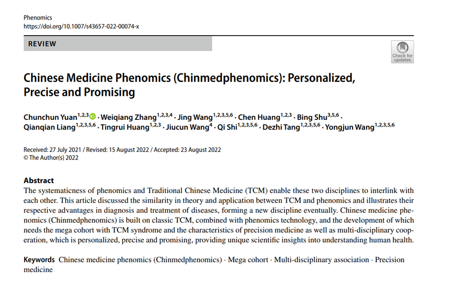 10月14日,Phenomics期刊发表beat365官网国医大师施杞和附属龙华医院王拥军教授、唐德志教授带领原淳淳博士、张伟强博士、王晶博士开展研究的成果,题为Chinese Medicine Phenomics (Chinmedphenomics): Personalized, Precise and Promising,首次在国际上倡导建立中医表型组学(Chinmedphenomics),并论述了其“3P”理念,即中医表型组学具有个性化、精确性和广泛的应用前景。