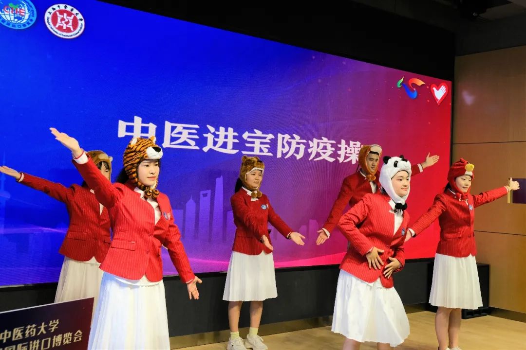 启动仪式上,经过创意升级的中医进宝防疫操再次闪亮登场。为了与进博会吉祥物“进宝”熊猫相呼应,“小叶子”志愿者们头戴五禽戏中虎、鹿、熊、猿、鸟的帽子,化身中医“进宝”,将传统保健功法五禽戏与现代流行舞蹈元素相融合,在舞出杏林学子蓬勃向上的精神面貌的同时也起到强身健体的作用,为“小叶子”筑起防疫健康屏障,向全世界展现中医药文化的独特魅力。