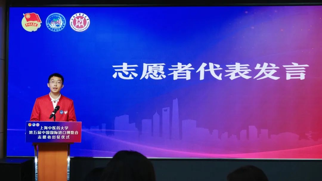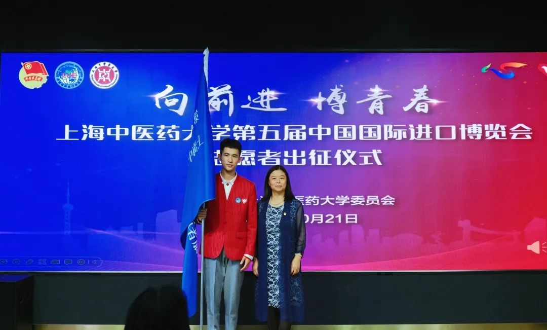 第五届中国国际进口博览会开幕在即,上中医“小叶子”5.0再次集结,准备出征!10月21日,beat365官方网站第五届中国国际进口博览会志愿者出征仪式在学校大学生创新创业实践园举行。今年是学校连续第五年派出“小叶子”们参与进博会的志愿服务,他们已蓄势待发、集结完毕,将以热情的服务、自信的面貌、向上的姿态,服务进博,展示上中医青年的青春风采。校党委副书记、副校长朱惠蓉,党委校长办公室、学工部(研工部)、保卫处、后勤保障处、宣传部(党委教师工作部),以及相关学院负责人等出席活动。