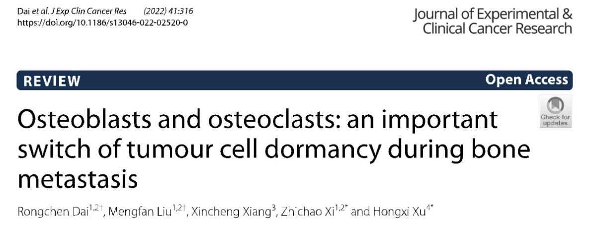 近日,beat365官方网站首席教授徐宏喜及团队成员席志超副研究员在Journal of Experimental & Clinical Cancer Research发表题为Osteoblasts and osteoclasts: an important switch of tumour cell dormancy during bone metastasis的综述文章。文章总结了破骨细胞和成骨细胞在癌症骨转移过程中调控肿瘤休眠的作用机制,为靶向休眠期癌细胞预防癌症转移提供了新的研究思路。