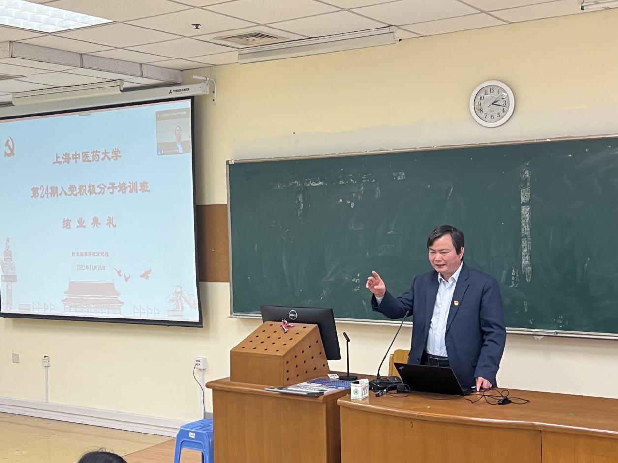 宋莉君作培训班学习总结。培训班历时一个月,通过理论学习与实践教育相结合,集中学习交流与个人自学相结合,线下与线上相结合的方式进行。在理论教育版块,邀请陈荣武教授,陈秋生、马杰,基础医学院党委副书记陆佩丽分别作关于党的二十大精神、党史、习近平总书记关于中医药工作的重要论述、党章等方面的专题报告。在红色基因实践教育版块,以小组为单位,赴中共一大、二大、四大纪念馆等实践教育基地接受党史学习教育,并开展了实践活动学习体会交流。在个人自学和小组交流版块,学员们认真研读党章、党的二十大报告、入党教材等,结合入党动机、新时代好青年的要求,剖析思想,明确努力方向。通过培训班的教育,学员们进一步加深对党的性质、宗旨、指导思想、奋斗目标和党员标准的理解,从而进一步加强党性修养,不断端正入党动机,自觉听党话、跟党走,立志为保障人民健康、传承创新发展中医药事业贡献力量。
