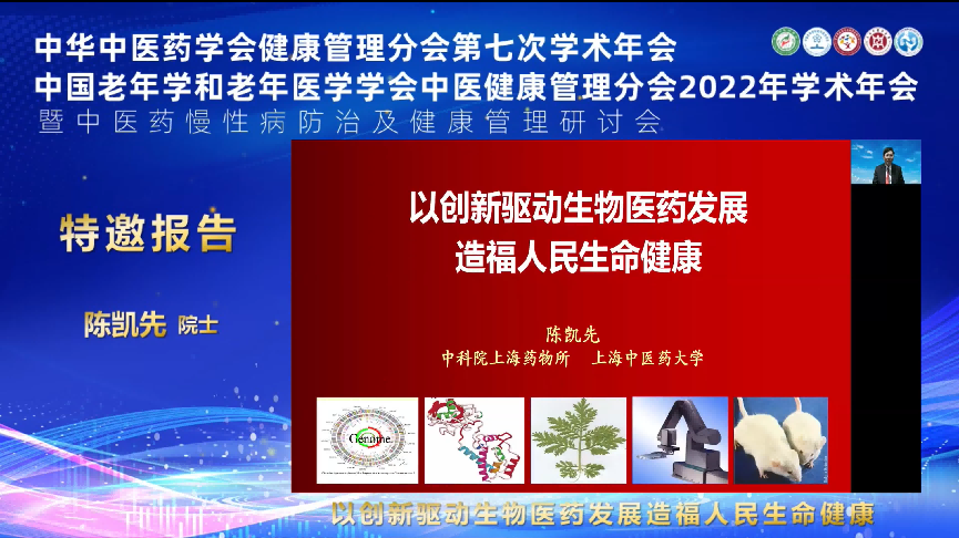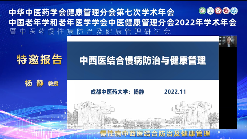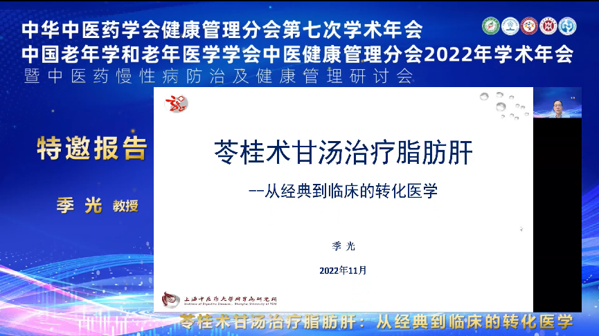 下午的两个分会场,共有24位中医药专家在线上为与会者带来了内容丰富的精彩报告。上海市浦东新区疾控中心主任周一心、成都中医药大学附属医院主任医师张文胜分别就疫情的防控及应激性失眠进行专题报告;长春中医药大学教授苏鑫、深圳市宝安纯中医治疗医院教授崔远武、西安市中医医院教授任晓芳、湖州市中心医院教授张晨从经方临方在健康管理中的应用作了交流。江西中医药大学附属医院的教授邓科穗、海南省中医院主任医师程亚伟、北京东直门医院教授苏惠萍、湖南中医药大学第二附属医院教授冯国湘以及中国中医科学院西苑医院的教授张晋则是从传统药膳和中医膏方对慢性病的调理作用作学术报告。在慢性病防治专题报告中,鲁南制药集团研究员姚景春、上海交通大学教授鲍勇、福建省第二人民医院教授游涛、浙江中医药大学教授刘翠清、北京中医药大学教授丁霞、北京东直门医院主任医师林欣潮、福建中医药大学附属第三人民医院教授陈淑娇以及上海市普陀区中心医院教授殷佩浩从炎症、免疫、衰老、胃肠病、糖尿病、癌症等慢性疾病的交流分享。老年学和老年医学学会教授肖劲松、王扬淦、沈洪解读了8月刚颁布的老年患者缺血性脑卒中、冠心病、消化性溃疡等慢性疾病的健康管理指南。