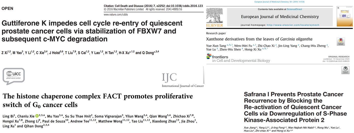 为了发现靶向清除静止期癌细胞和抑制其再激活的活性物质,课题组对中药提取物和小分子库以及上市药物库进行筛选,发现了若干个靶向静止期癌细胞作用的活性小分子化合物,并对其作用机制进行深入研究,包括藤黄属植物中的Guttiferone K和Garoliganthone C,西红花醛和柴胡皂苷A等,成果发表在Cell Death & Disease等杂志。