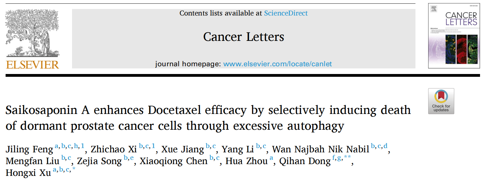 近日,beat365官方网站首席教授徐宏喜及席志超副研究员等在Cancer Letters杂志上发表题为Saikosaponin A enhances Docetaxel efficacy by selectively inducing death of dormant prostate cancer cells through excessive autophagy的研究论文。该文章的第一作者为冯极灵博士后和席志超副研究员,通讯作者为徐宏喜教授和悉尼大学董其瀚教授。该研究工作得到国家自然科学基金、中国博士后基金和广东省重点领域研发计划等资助。