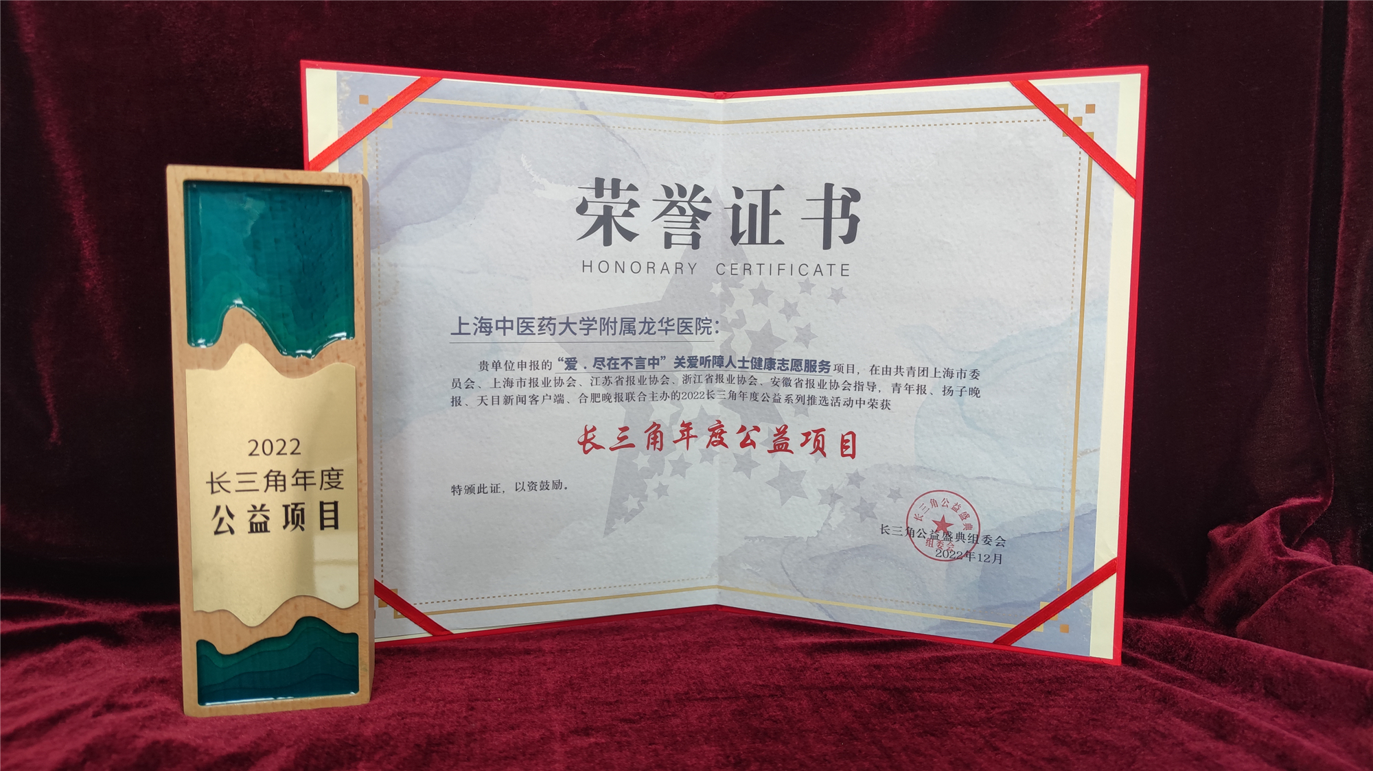 经社会申报、组委会初评、专家终评、名单公示等环节,经长三角公益盛典组委会审定,龙华医院“爱·尽在不言中”关爱听障人士健康志愿服务项目获评为“2022长三角年度公益项目”。