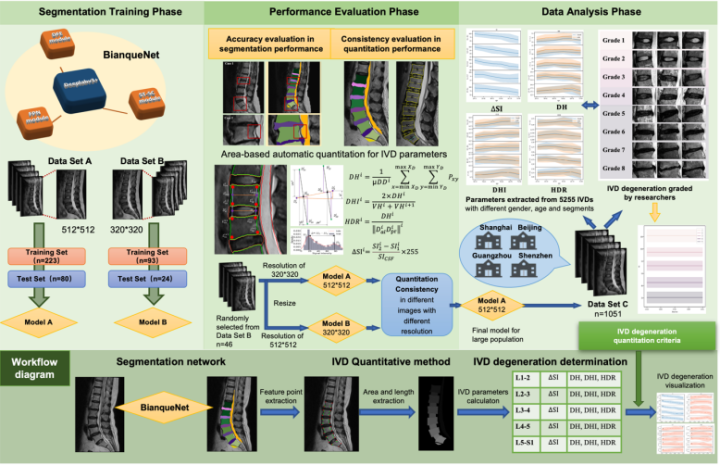 针对这一难题,该团队通过多学科交叉融合,率先开发出基于深度学习语义分割网络的椎间盘退变量化分析算法——BianqueNet。基于该算法极高的精准度,团队对全国4个城市共计1051例人群进行横断面研究,结果表明椎间盘内信号差异与椎间盘退变等级显著相关;再结合对不同人群基线特征(年龄、性别、椎间盘节段)构建不同椎间盘退变等级的参量标准,从而实现不同人群的精准化椎间盘退变自动量化评估,对椎间盘表观遗传学及经筋失衡研究具有很重要的指导价值。