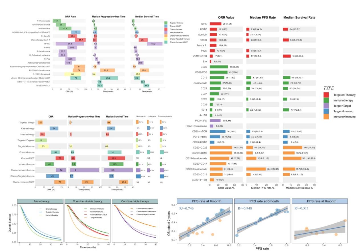 该研究基于全球58项临床试验(包含3124名受试者),对目前11类r/r DLBCL治疗方案的疗效、安全性及其影响因素进行了系统的定量分析,包括单用化疗、单用靶向、单用免疫、化疗+免疫、化疗+ASCT、靶向+靶向、免疫+免疫、靶向+免疫、化疗+靶向+免疫、化疗+免疫+免疫和化疗+免疫+ASCT。研究发现是否联合治疗是影响r/r DLBCL患者的客观缓解率(ORR)、无进展生存期(PFS)和总生存期(OS)的重要因素。不同治疗种类中,化疗联合免疫治疗、化疗序贯ASCT以及化疗联合放射免疫治疗序贯ASCT的疗效较为突出,但3-5级中性粒细胞减少症、白细胞减少症以及血小板减少症的发生率较高。具体到治疗方案,Rituximab + Inotuzumab ozogamicin、Rituximab + BEAM + ASCT、Rituximab + ESHAP + Lenalidomide、iodine-131 Tositumomab + BEAM + ASCT和CAR-T的疗效较为突出。另外研究发现,联合治疗下6个月PFS与2年OS之间存在很强的相关性(R2=0.95),提示在r/r DLBCL治疗中,6个月PFS可作为2年OS的替代终点。该研究结果也可为中医药治疗r/r DLBCL的疗效判定提供可靠的参考。