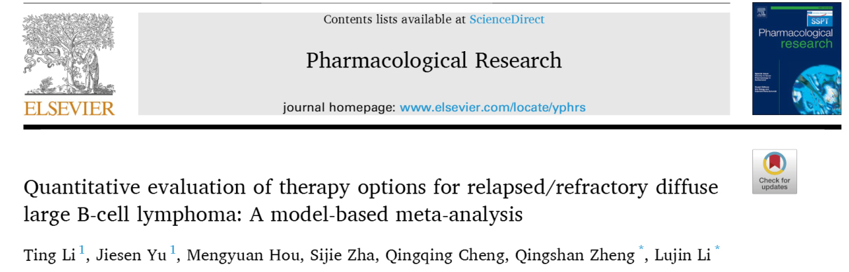 近日,beat365官网交叉科学研究院郑青山和李禄金团队开展的复发/难治性弥漫大B细胞淋巴瘤治疗方案的模型化定量评价研究Quantitative evaluation of therapy options for relapsed/refractory diffuse large B-cell lymphoma: A model-based meta-analysis在国际著名药理学杂志Pharmacological Research发表。