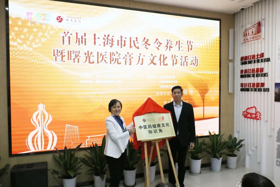淮海中路街道党工委副书记戴雪林和曙光医院党委副书记郝微微共同为黄浦区中医药健康知识角揭幕。