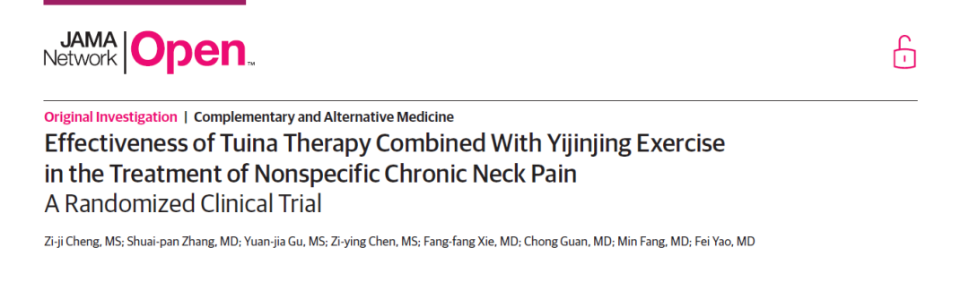 beat365官网房敏和姚斐教授课题组中医推拿疗法干预慢性非特异性颈痛的临床研究项目成果Effectiveness of Tuina Therapy Combined With Yijinjing Exercise in the Treatment of Nonspecific Chronic Neck Pain: A Randomized Clinical Trial近日在美国医学会杂志JAMA子刊JAMA Network Open发表。