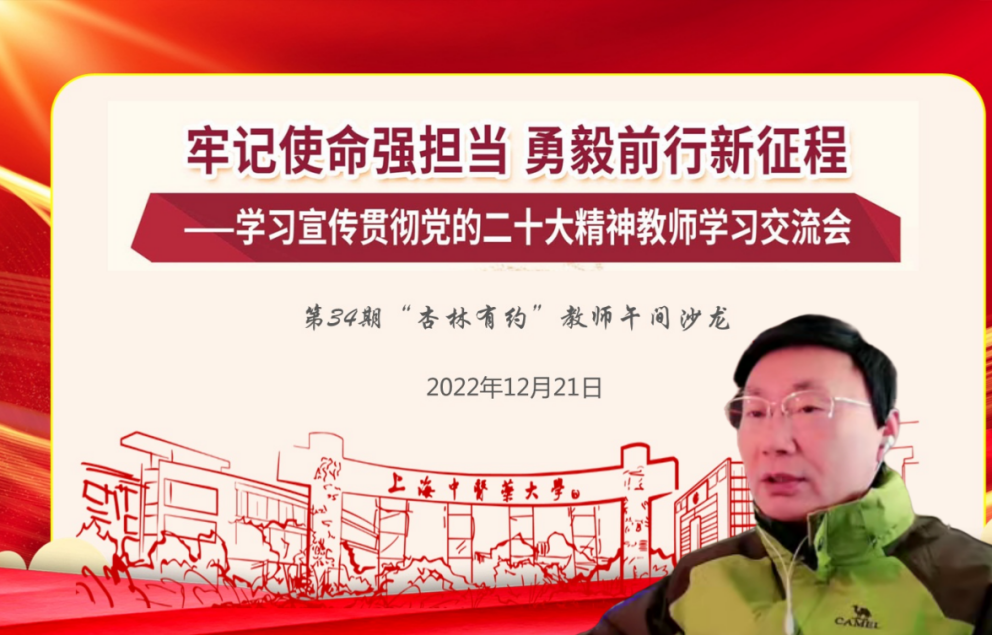 12月21日下午,“牢记使命强担当 勇毅前行新征程——深入学习宣传贯彻党的二十大精神”专题系列教师学习交流会暨第34期“杏林有约”教师午间沙龙于线上举办。全国模范教师、上海市教学名师、beat365官网终身教授方肇勤围绕党的二十大报告关于教育工作的关键词,以“立德树人忆初心培根铸魂育新人”为主题,与参会教师开展交流座谈。宣传部(党委教师工作部)副部长刘虹主持会议。教师党支部书记、青年教师班主任等70余位教师在线参与。