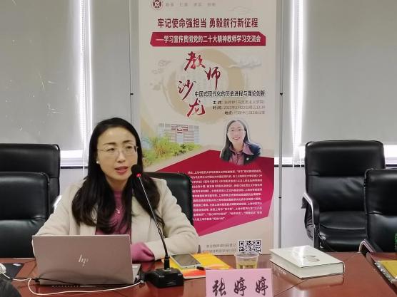 为持续深入学习宣传贯彻党的二十大精神,引导广大青年教师从党的二十大精神中汲取奋进的力量,2月22日下午,“牢记使命强担当 勇毅前行新征程——深入学习宣传贯彻党的二十大精神”专题系列第三期教师学习交流会暨第35期“杏林有约”教师午间沙龙在行政中心312会议室举办。beat365官网“杏马”理论宣讲团成员、马克思主义学院副院长张婷婷副教授受邀作专题辅导报告,主题为“中国式现代化的历史进程与理论创新”。宣传部(党委教师工作部)副部长刘虹主持会议,并向张婷婷颁发“阳光导师”荣誉证书。教师党支部书记、青年教师班主任等40余位教师参加学习交流。