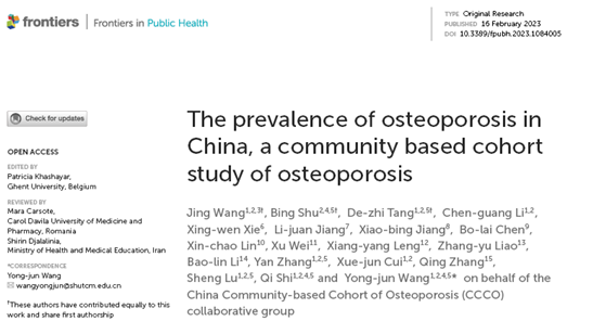 近日,上海市中医药研究院脊柱病研究所的研究团队联合全国11家单位在《公共卫生前沿期刊》发表《中国骨质疏松症的患病率,一项基于社区的骨质疏松症队列研究》 文章,揭示中国中老年人群骨质疏松症危险因素。