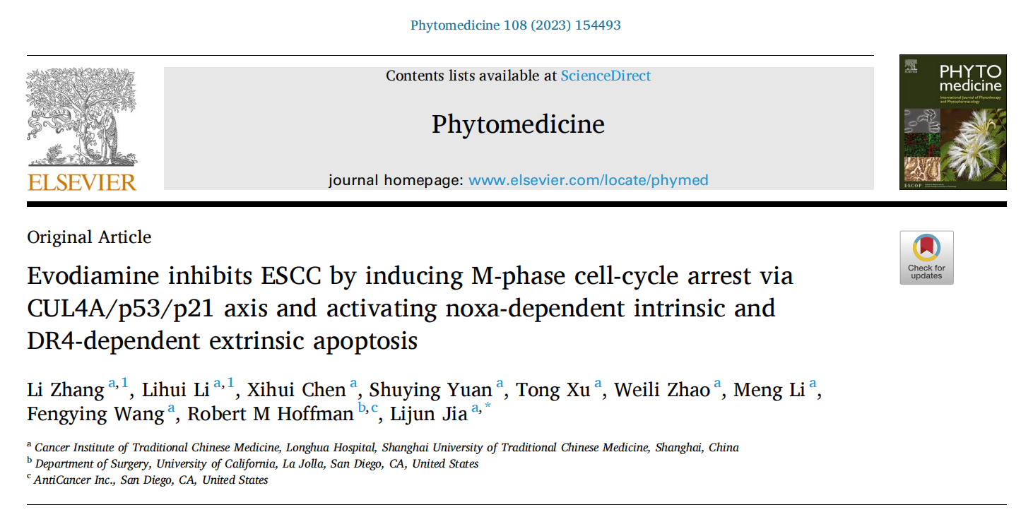 beat365官方网站附属龙华医院、上海市中医药研究院中医肿瘤研究所贾立军教授团队选取中药吴茱萸中主要活性成分——吴茱萸碱(Evodiamine,Evo),针对其抗食管癌效果及相关的分子调控机制,开展了深入研究。近期,团队以研究论文形式在国际权威期刊Phytomedicine上发表了最新研究成果Evodiamine inhibits ESCC by inducing M-phase cell-cycle arrest via CUL4A/p53/p21 axis and activating noxa-dependent intrinsic and DR4-dependent extrinsic apoptosis。