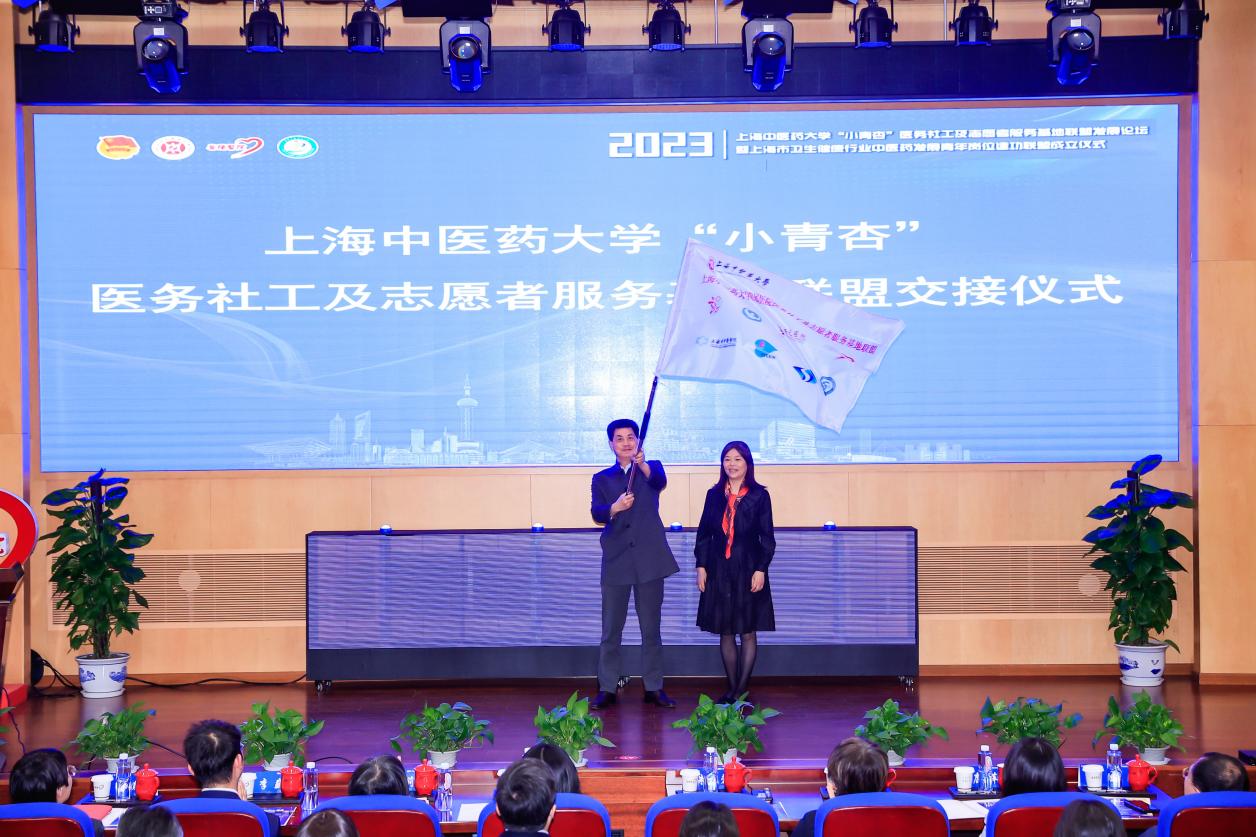 在beat365官方网站“小青杏”医务社工及志愿者服务基地联盟旗帜交接仪式上,朱惠蓉为新一届轮值单位上海市中西医结合医院授旗。