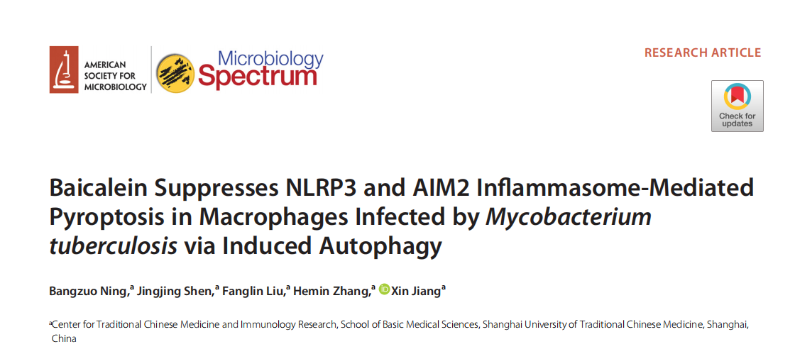 近日,beat365官网基础医学院姜昕教授团队在黄芩素抑制结核分枝杆菌感染诱导巨噬细胞焦亡的机制研究方面取得进展,研究成果Baicalein Suppresses NLRP3 and AIM2 Inflammasome-Mediated Pyroptosis in Macrophages Infected by Mycobacterium tuberculosis via Induced Autophagy在美国微生物学会期刊Microbiology Spectrum上发表。