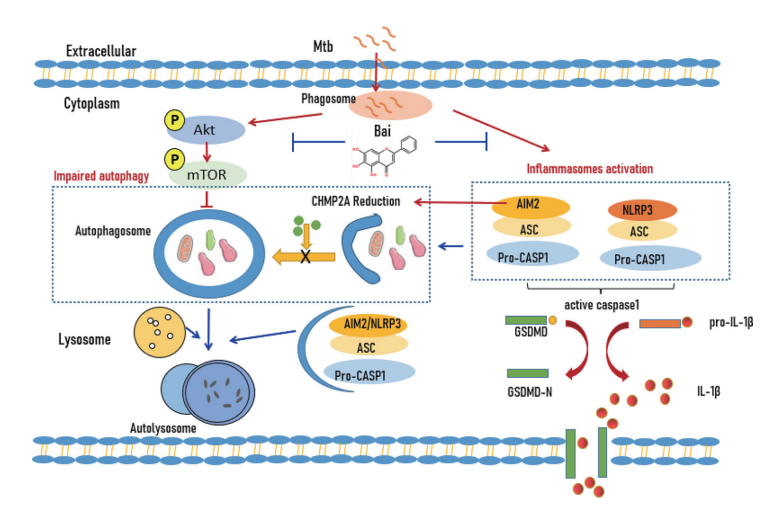 该研究发现了芩部丹中黄芩的主要活性成分黄芩素发挥HDT的作用及其分子机制:黄芩素具有抑制结核菌感染诱导的巨噬细胞焦亡作用,其机制与抑制NLRP3和AIM2炎症小体的激活以及促进自噬相关。其促进自噬的机制一方面是通过抑制Akt/mTOR通路的激活从而上调自噬,另一方面是通过抑制AIM2蛋白上调自噬相关蛋白CHMP2A的表达发挥促进自噬作用。该研究为黄芩素在结核病治疗中成为有前途的HDT辅助药物提供了有力的实验依据。