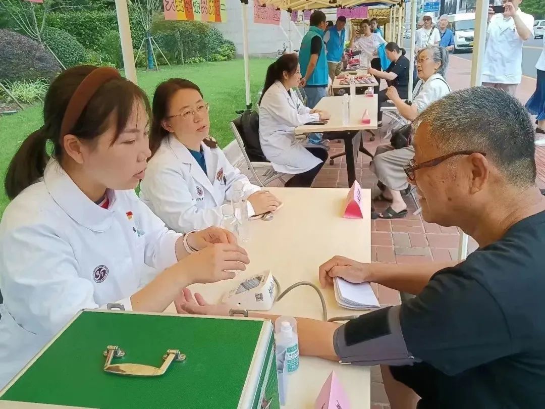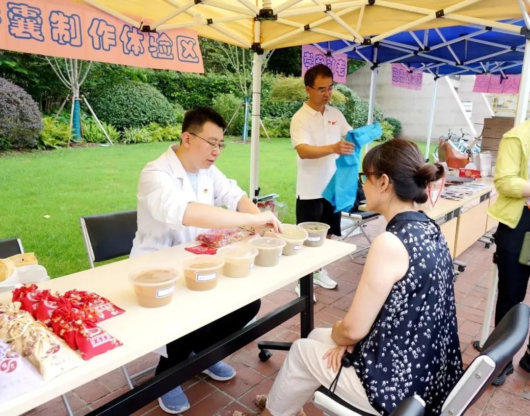 值此契机,医院充分发挥医疗资源优势,组织医院老年科、心血管科、推拿科党员作为志愿者走进街道,为民办实事、开展义诊活动,耐心地为市民提供健康咨询以及诊疗服务,认真倾听就诊居民的既往病史,细致讲解预防诊治问题,帮助群众及时掌握自己的身体健康情况;带领街道居民参与互动体验、制作传统香囊,让市民们零距离感受传统医学魅力,推动中医药文化更好地融入群众生活。活动现场气氛热烈而有序,前来咨询和问诊的市民络绎不绝。