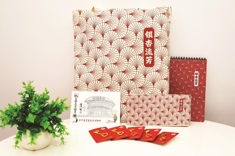 在一套取名“银杏流芳”的系列文创新生礼中,形似古典钥匙的“五行徽章”颇有看点。参照中国传统哲学的五行理论,“五行徽章”分为5种式样,5款钥匙齿部分别以五行对应的五色为底色,采用“九叠篆”印章字体,刻以“木”“火”“土”“金”“水”字样,手柄部分设计成葫芦形状,寓意“悬壶济世”。