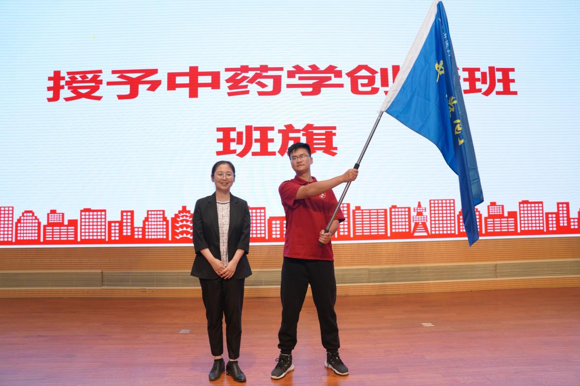 张亭立为中药学创新班授予班旗,沈漫、葛芳芳为学生代表佩戴班徽。2023级中药学创新班张凌月作为新生代表发言,表示将以“勤奋、仁爱、求实、创新”校训为引领,努力成长为能够推动中医药事业发展的优秀人才。