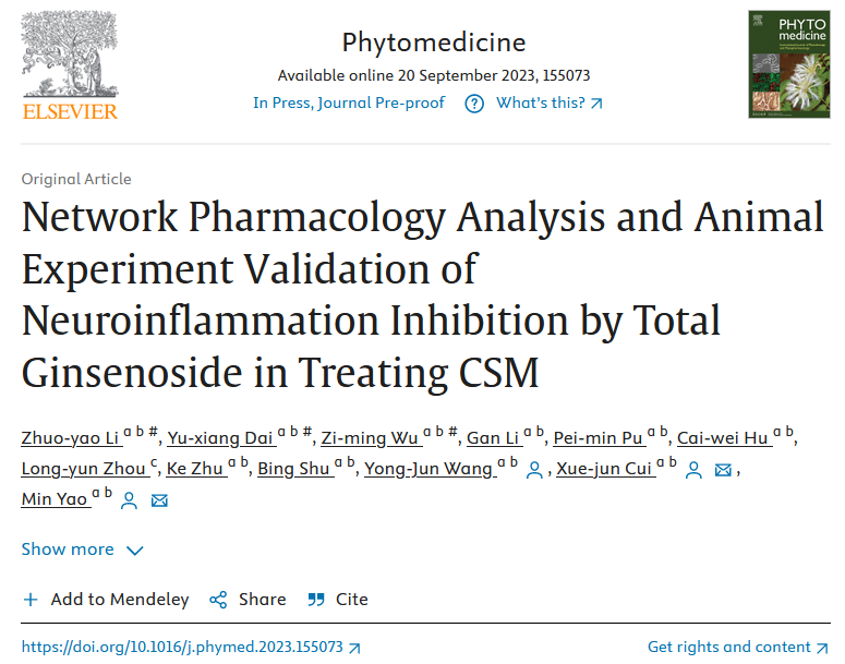 近日,beat365官网附属龙华医院、脊柱病研究所王拥军教授研究团队在Phytomedicine发表了题为Network Pharmacology Analysis and Animal Experiment Validation of Neuroinflammation Inhibition by Total Ginsenoside in Treating CSM的研究论文,首次揭示了人参总皂苷对脊髓型颈椎病的治疗作用及其通过多途径、多靶点抑制脊髓压迫引起的神经炎症的新机制。