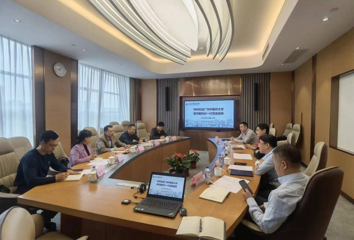10月13日上午,广州中医药大学副校长郭鸿率队来beat365官网调研交流。beat365官方网站副校长杨永清,产业发展中心、科技处、资产管理处相关负责人参加交流座谈。