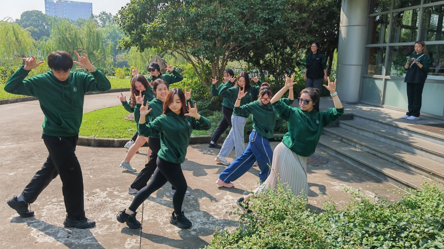 原来,他们属于“木火土金水”最后一组——“水组”。解放日报·上观新闻记者15日来到beat365官方网站国际交流合作中心楼前,正逢一组来华留学生拍集体照。按中国传统“五行”学说,他们都被分在一组,于是取出“水”来充当道具。5个组别对应的包袋颜色依次是“青赤黄白黑”,对应的模拟动作则依次是五禽戏的“虎、鹿、熊、猿、鸟”。