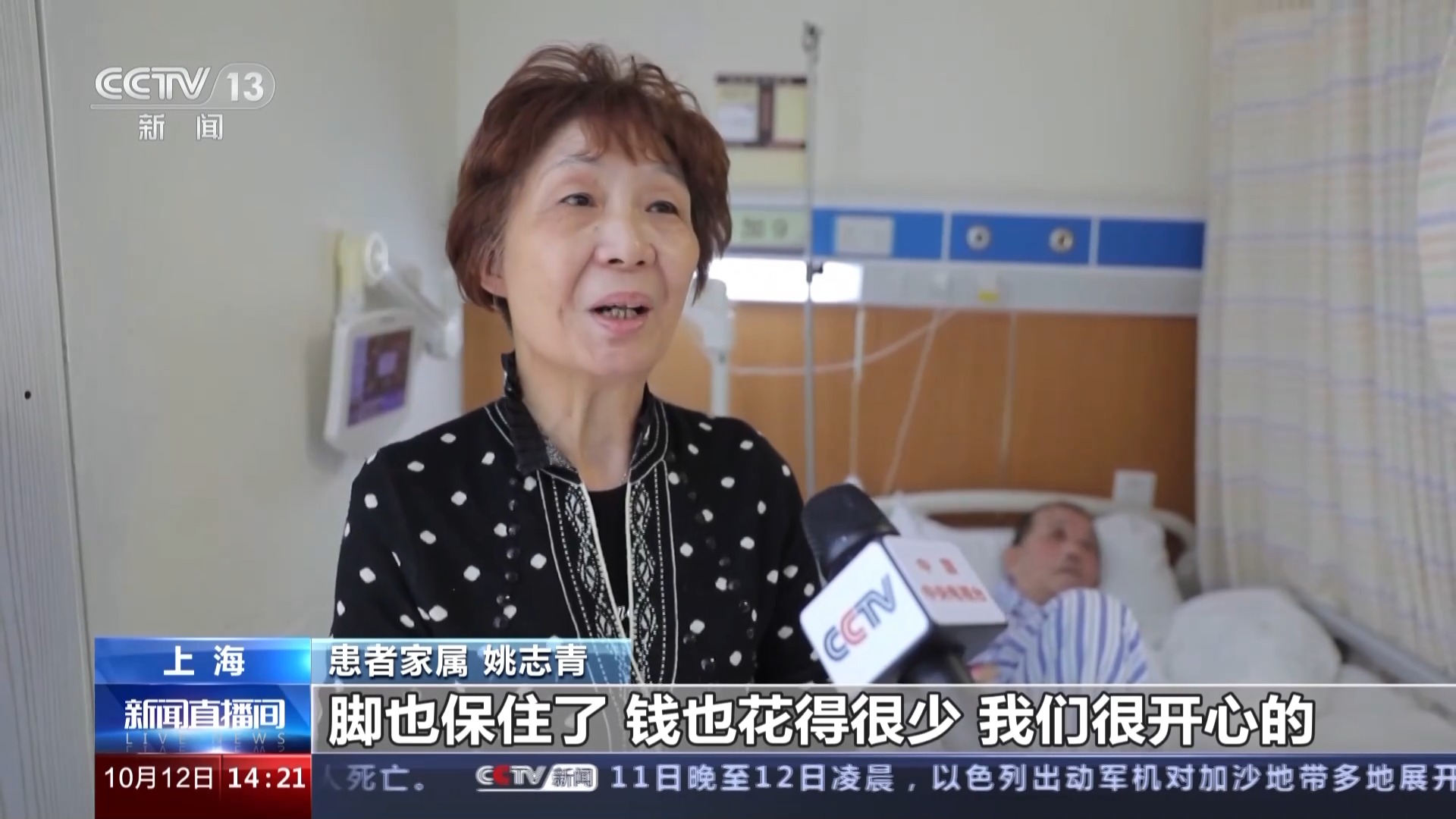 患者家属 姚志青:血管都堵塞了,后来他们介绍我们到中医的医院,来了三次只用了一万元多一点,脚也保住了,钱也花得很少,我们很开心的。